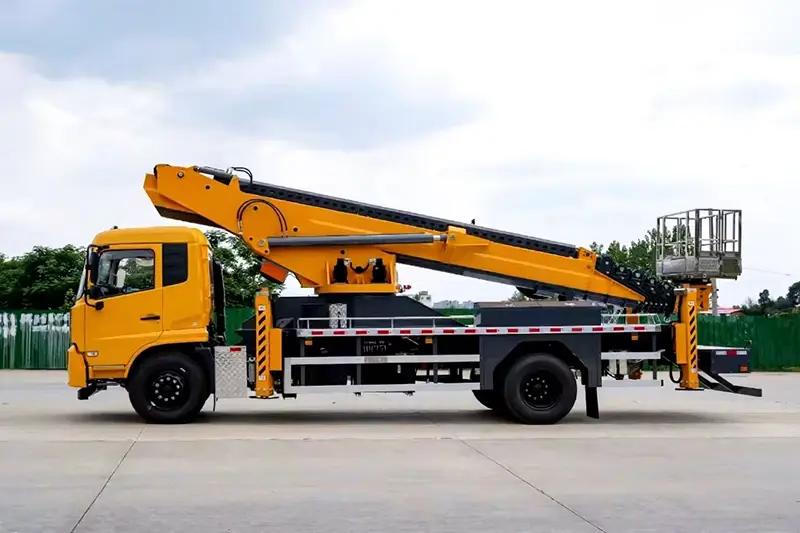 Odp.: Wykorzystuje podwozie Dongfeng z emisją Euro 6, z podporami typu X o dużej rozpiętości i podwójnymi siłownikami podnoszącymi, wyjątkowo niskim kołysaniem wysięgnika, stabilnym i bezpiecznym nawet na maksymalnej wysokości 45 m.